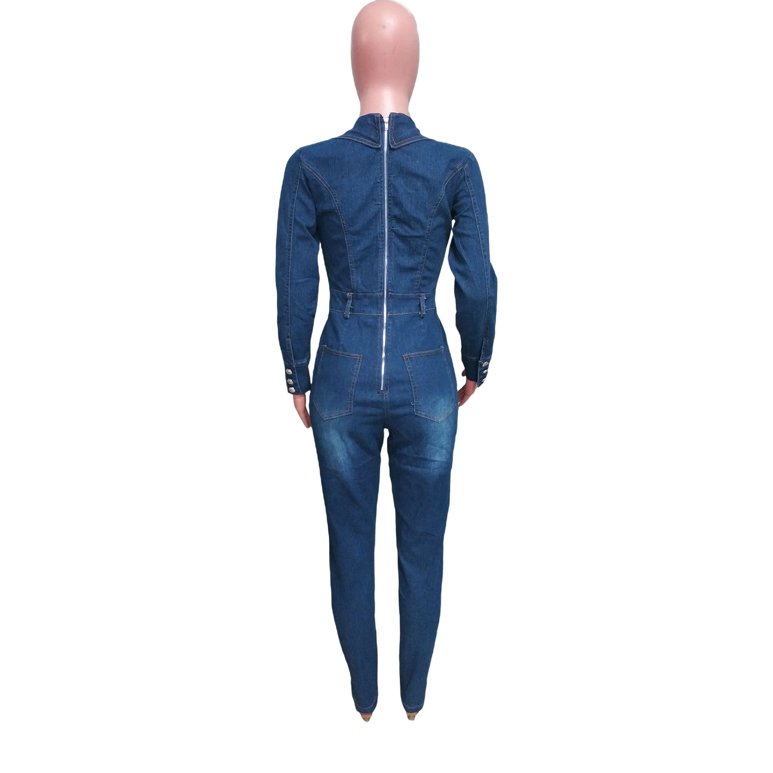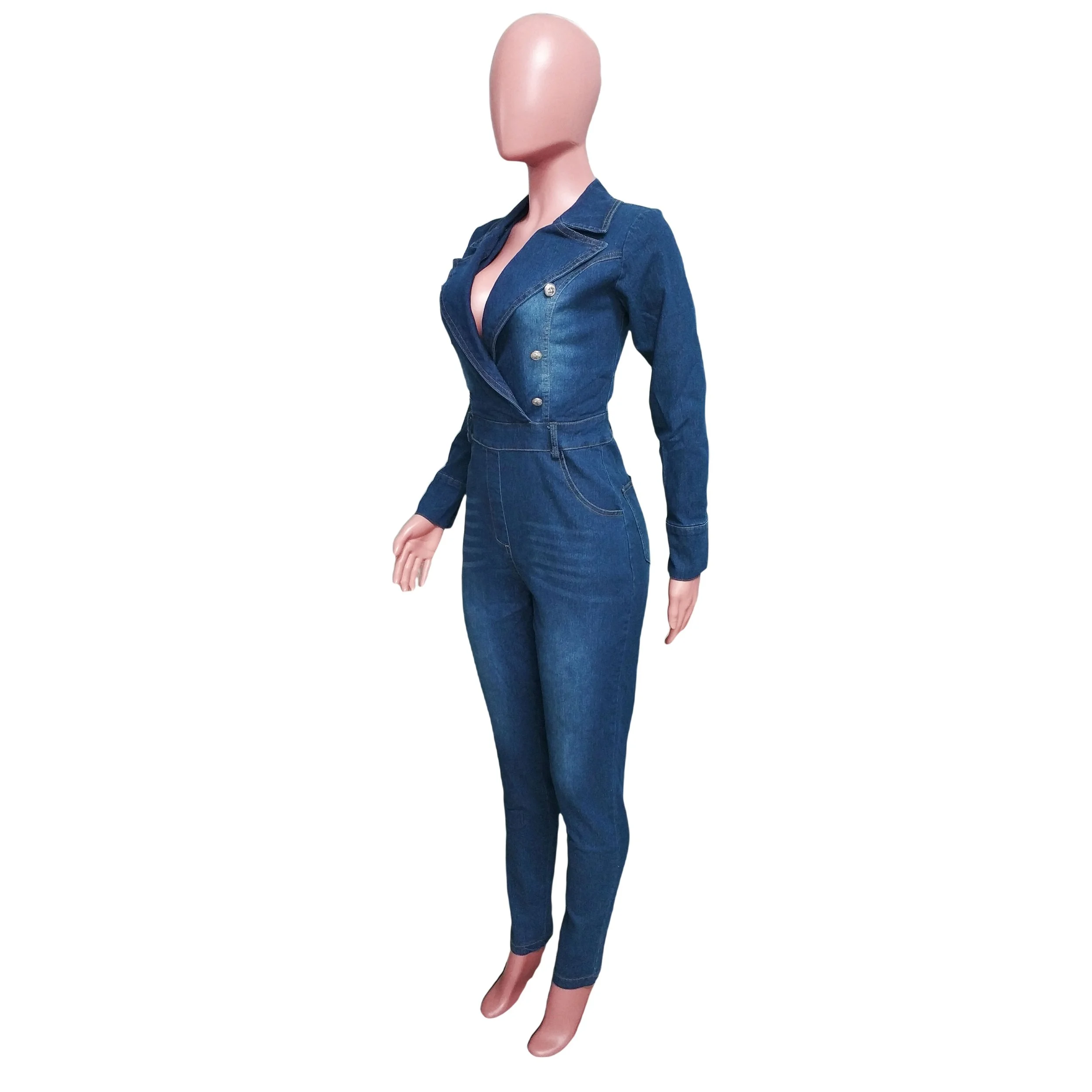 Step into effortless style with this denim long sleeve jumpsuit, designed with a flattering notched lapel collar and double-breasted button front for a chic tailored look. Perfect for casual days, work, or nights out, this one-piece outfit combines comfort with modern fashion.